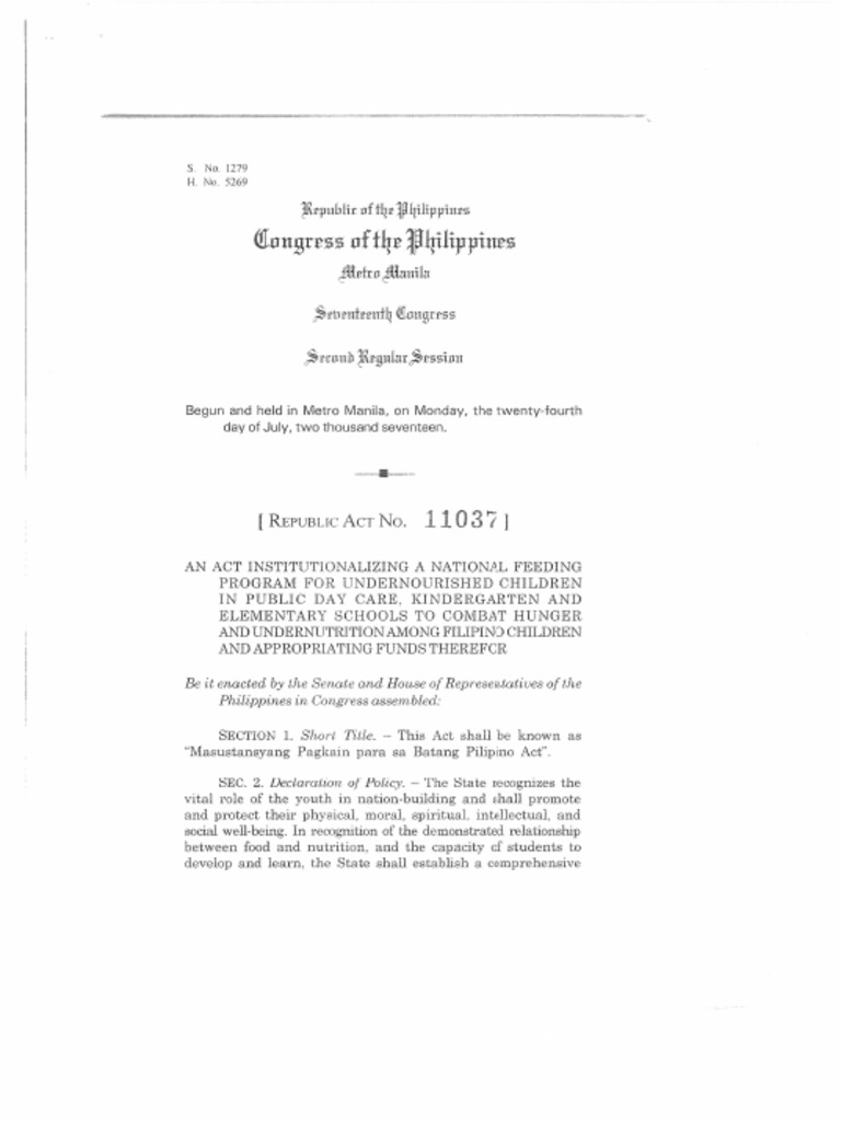 11037 or the Masustansyang Pagkain Para sa Batang Pilipino Act was signed last June 20. Bam referring to Republic Act 11037 or the Masustansiyang Pagkain para sa Batang Pilipino Act. 1279 and House Bill No.