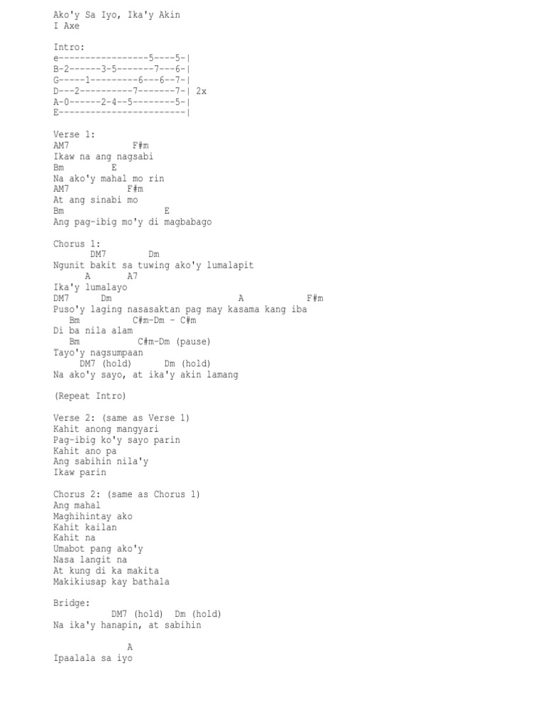 IAxe Intro AM7 - Bm7 - Cm7 - DM7 - Dm A Fm7 - Bm7 Ikaw na ang may sabi E Na akoy mahal mo rin A Fm7 - Bm7 Ang sinabi mong E Ang pag-ibig moy di magbabago Refrain DM7 Dm A - A7 Ngunit bakit sa tuwing akoy lumalapit ikay lumalayo DM7 Dm A Fm Pusoy laging nasasaktan pag may kasama kang iba Chorus Bm7. 4162020 AKOY SA IYO IKAY AKIN By. Choose one of the browsed Akoy Sayo At Ikay Akin Lamang lyrics get the lyrics and watch the video.
